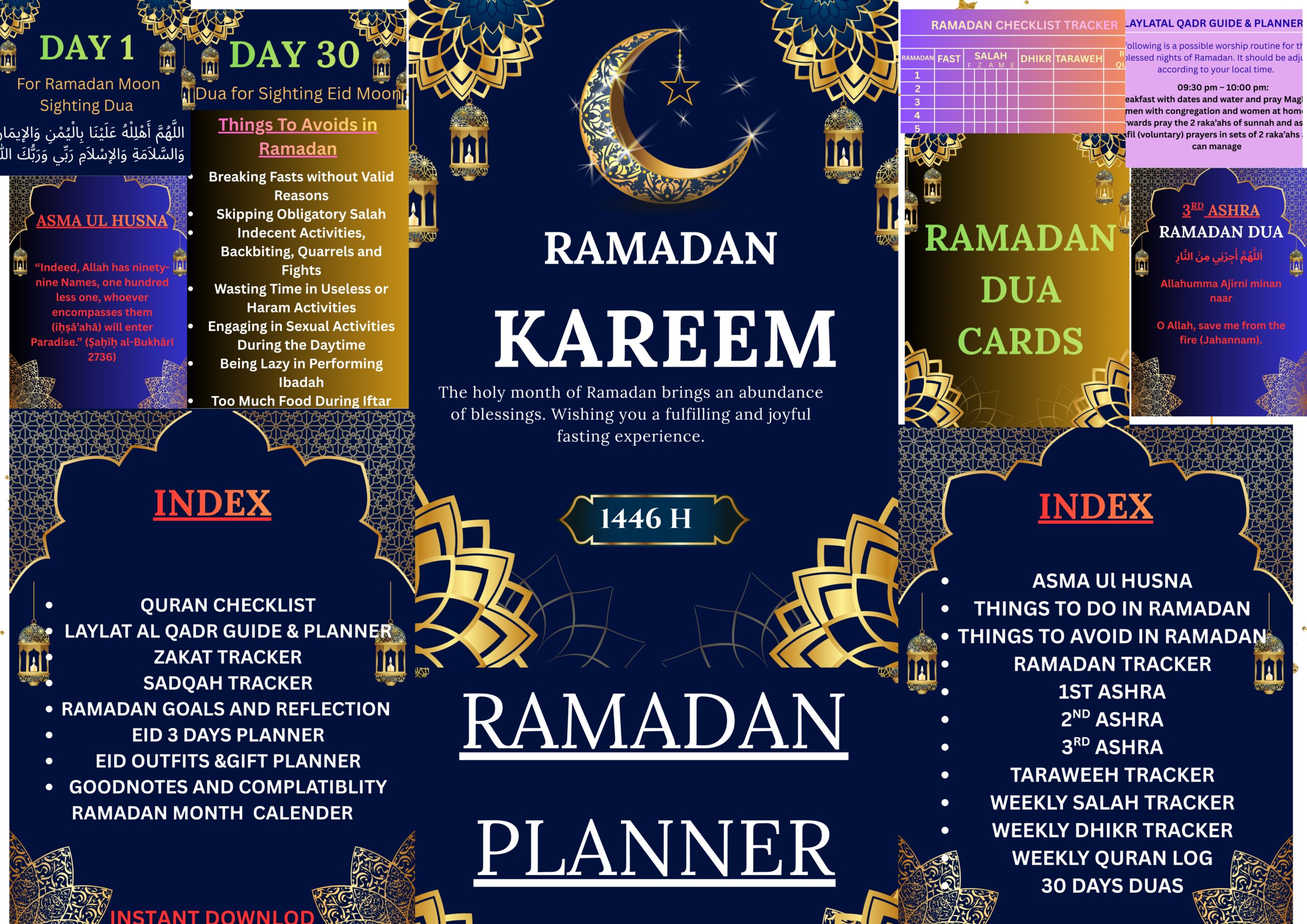 🚀 Make your Ramadan more organized, productive, and spiritually uplifting with this beautifully designed Ramadan Planner Template. Perfect for Muslims of all ages, this planner helps you track your fasting, prayers, Quran goals, duas, and daily Ramadan routines.